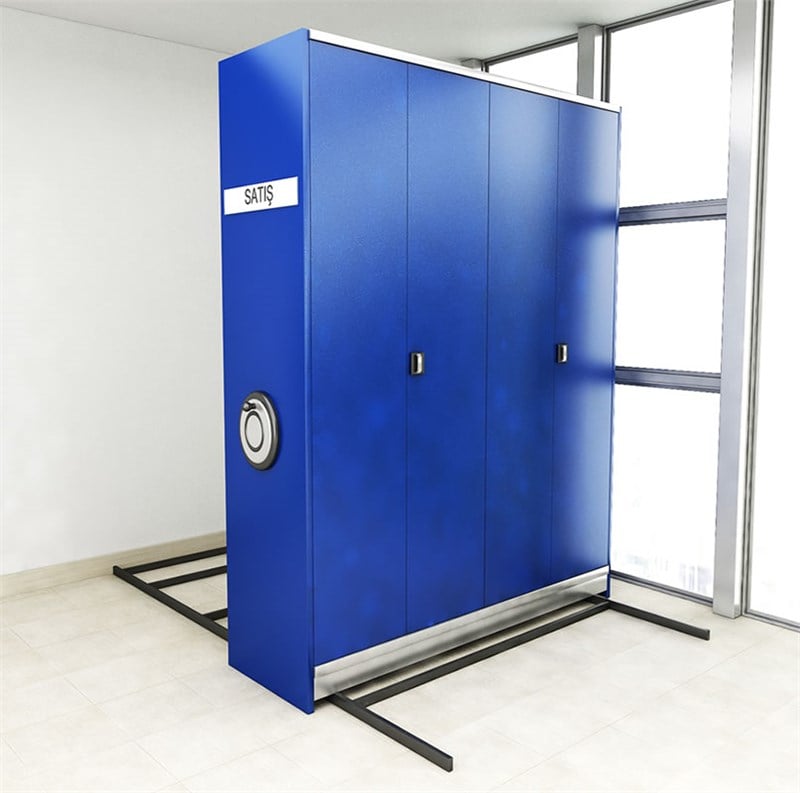 2.  Sistem tekerlekleri ile özel olarak hazırlanmış lama raylar üzerinde hareket ederek birbirinden ayrılan ve birbirine yanaşan seri dolaplardan oluşmaktadır.